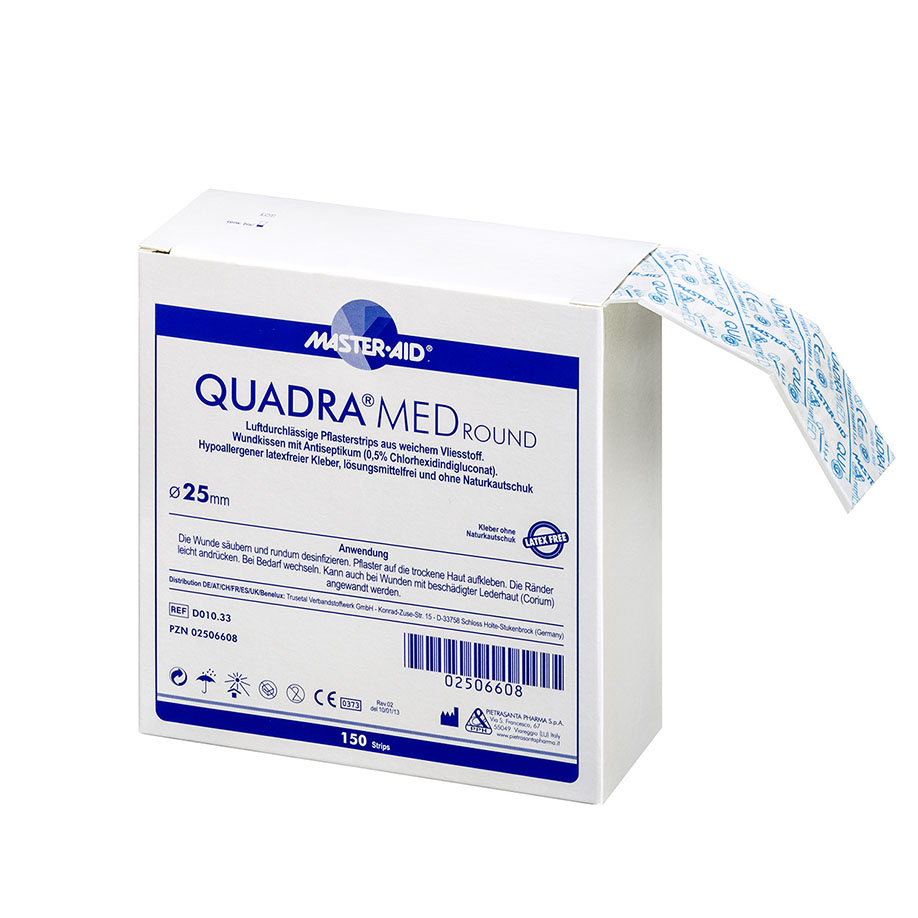 QUADRA®MED-Pflaster bestehen aus einem luftig-weichen Vliesmaterial, das den Heilungsprozess bei geschädigter Haut positiv beeinflusst. Einzeln eingeschweißter, latexfreier, runder Wundverband. Der verwendete hypoallergene Hotmelt-Kleber sorgt für eine sehr gute Hautverträglichkeit. Die saugstarke Wundauflage (Ø 12 mm), auf der das Antiseptikum Chlorhexidindigluconat (0,5%) aufgebracht ist, ist antibakteriell und unterstützt daher wirksam die Prävention und Behandlung von Wundinfektionen. Anwendungsgebiet: bei kleinen bis mittelgroßen Wunden.