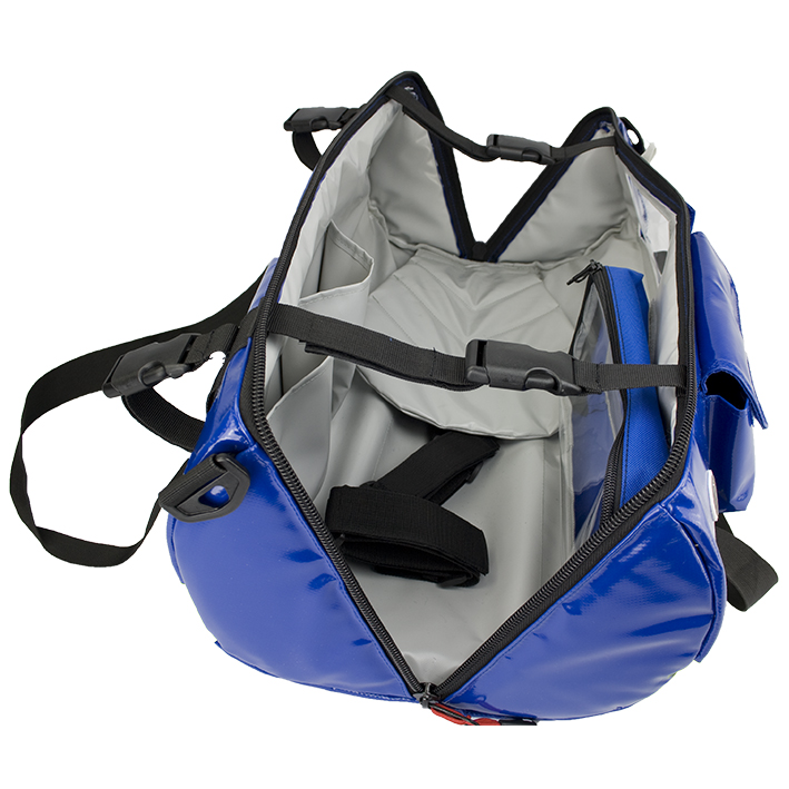 Hochwertige Sauerstoff-Tragetasche BLUE PLANE aus blauem, strapazierfähigem und wasserabweisenden Planenmaterial mit gelben Reflexstreifen. Die Tasche verfügt über eine Außentasche und zwei Innentaschen. Zusätzlich befindet sicht im Innenraum eine Modultasche, welche mit Klett an der Tache fixiert wird. Diese bietet zusätzlichen Stauraum für zum Beispiel O2-Brillen oder O2-Schläuche. Durch das an der Seite befindliche Sichtfenster ist der Druckminderer stets gut zu erkennen. Das Fenster kann bei Bedarf geöffnet werden, wodurch ein direkter Zugang zum Druckminderer möglich ist.