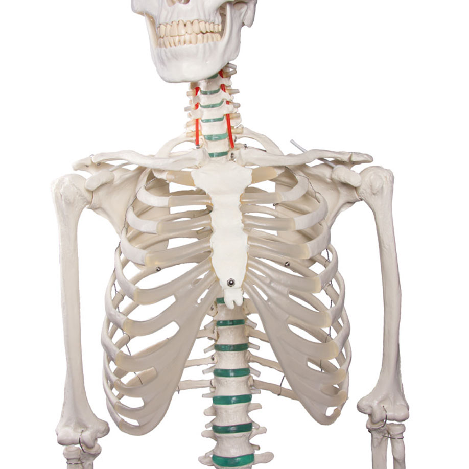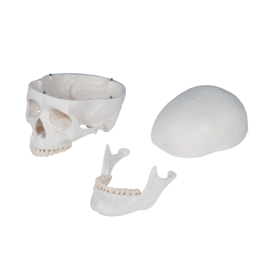 Das Skelett wird nach strengen Qualitätsvorgaben hergestellt. Die stabile Verarbeitung und robuste Ausführung gewährleistet eine langlebige Qualität auch bei intensiver Benutzung. Hergestellt aus haltbarem, unzerbrechlichem Kunststoff. Die Zähne sind separat gefertigt und einzeln in den Kiefer eingesetzt. Die Gliedmaßen können per Schnellverschluss einfach und schnell abgenommen und wieder angebracht werden. Schulter, Hüfte und Knie verfügen über flexible Gummiverbindungen, die eine lebensechte, gleitende Bewegung der Gelenke erlauben. Die etwa 200 Knochen des Skeletts entsprechen in Größe und annähernd im Gewicht den echten menschlichen Knochen. Das Skelett ist anatomisch korrekt und vollständig, es zeigt alle wichtigen Strukturen und Foramina. Der dreiteilige Schädel wurde digitalisiert und so angepasst, dass er genau der Standard-Anatomie entspricht. Die Größe entspricht der europäischen Durchschnittsgröße, alle wichtigen Strukturen, Fissuren, Foramina und Processus sind vorhanden. Der Schädel ist zerlegbar in Schädelbasis, Unterkiefer und Schädeldach. Das Schädeldach ist mit Metallstiften an der Schädelbasis ausgerichtet und wird durch Magnete gehalten. Die Wirbelsäule des Skeletts zeigt die Spinalnerven, die Arteria vertebralis und einen dorsolateralen Bandscheibenvorfall. 5-strahliges Rollenstativ, robust, leichtgängig und abnehmbar. Natürliche Skelett-Größe (Größe: 178 cm mit Stativ). Gewich: 9 kg. Verpackungsmaße: 98 x 47 x 29 cm