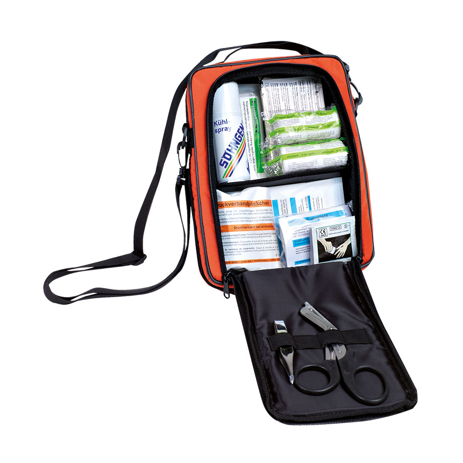Ideal beispielsweise beim Wandern. Inhalt: u. a. aluderm® Verbände wie Kompressen, Augenkompressen, Quickverbände, aluderm® alufinger, Spezial-Druckverbandpäckchen, Dreiecktuch, Kühlspray, SIRIUS® Rettungsdecken, Binden, SÖHNGEN®-Silk Pflasterstreifen, aluderm®-aluplast Wundpflaster, Einmalhandschuhe, Beatmungshilfe, Verbandkastenschere, Pinzette, Wundreinigungstücher. Ca. 310 x 225 x 70 mm, wasserabweisendes Nylongewebe, orange, Steckschlaufen in der Deckellasche, Boden mit Unterteilung. Gürtelschlaufen, Tragegriff, längenverstellbarer, aushakbarer Schultergurt, doppelläufiger Reißverschluss.