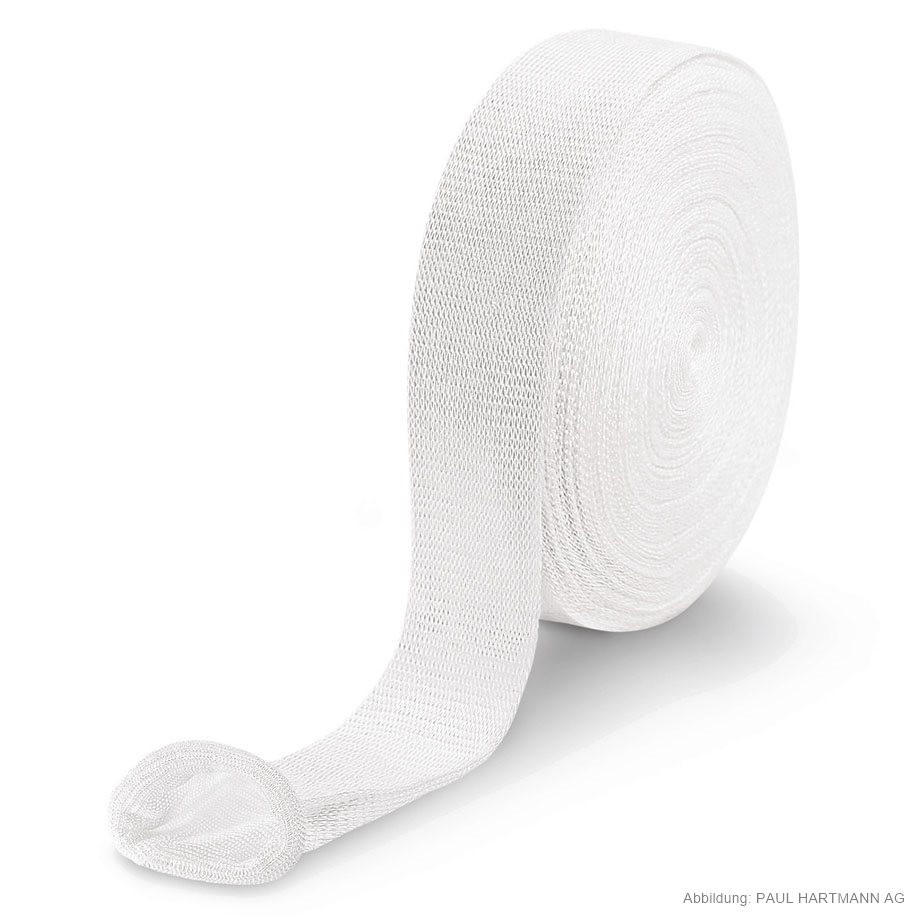 Nahtlos gestrickter Schlauchverband (70 % Viskose, 30 % Baumwolle) mit hoher Querdehnbarkeit, ohne Hilfsmittel einfach anzulegen, kann an jeder beliebigen Stelle durchtrennt werden, ohne dass Laufmaschen entstehen, faltenloser Sitz, durch geschlossene Oberfläche auch bei mechanischer Beanspruchung kein Lockern, sodass Wunden oder empfindliche Hautpartien zuverlässig geschützt werden, saugfähig, luftdurchlässig und sterilisierbar (Dampf A 134 °C).