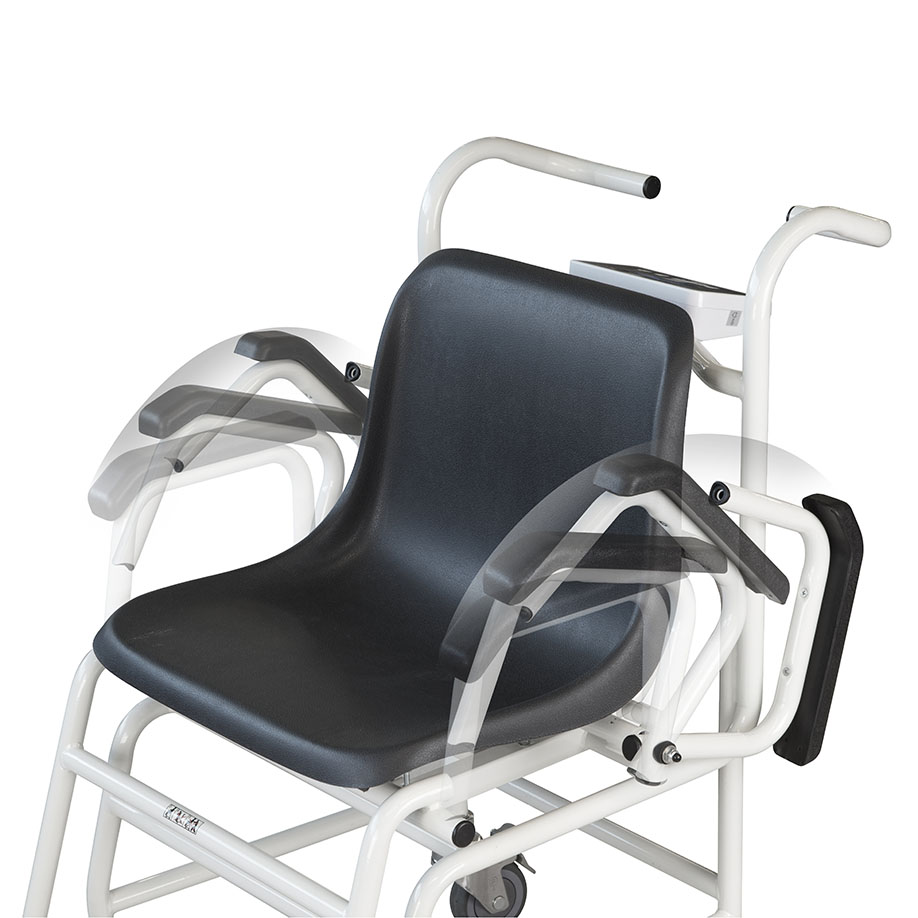 - zwei umklappbare Armlehnen und Fußstützen erleichtern das Platznehmen, ideal für übergewichtige Patienten oder zum barrierefreien Umsetzen z. B. vom Bett auf die Stuhlwaage