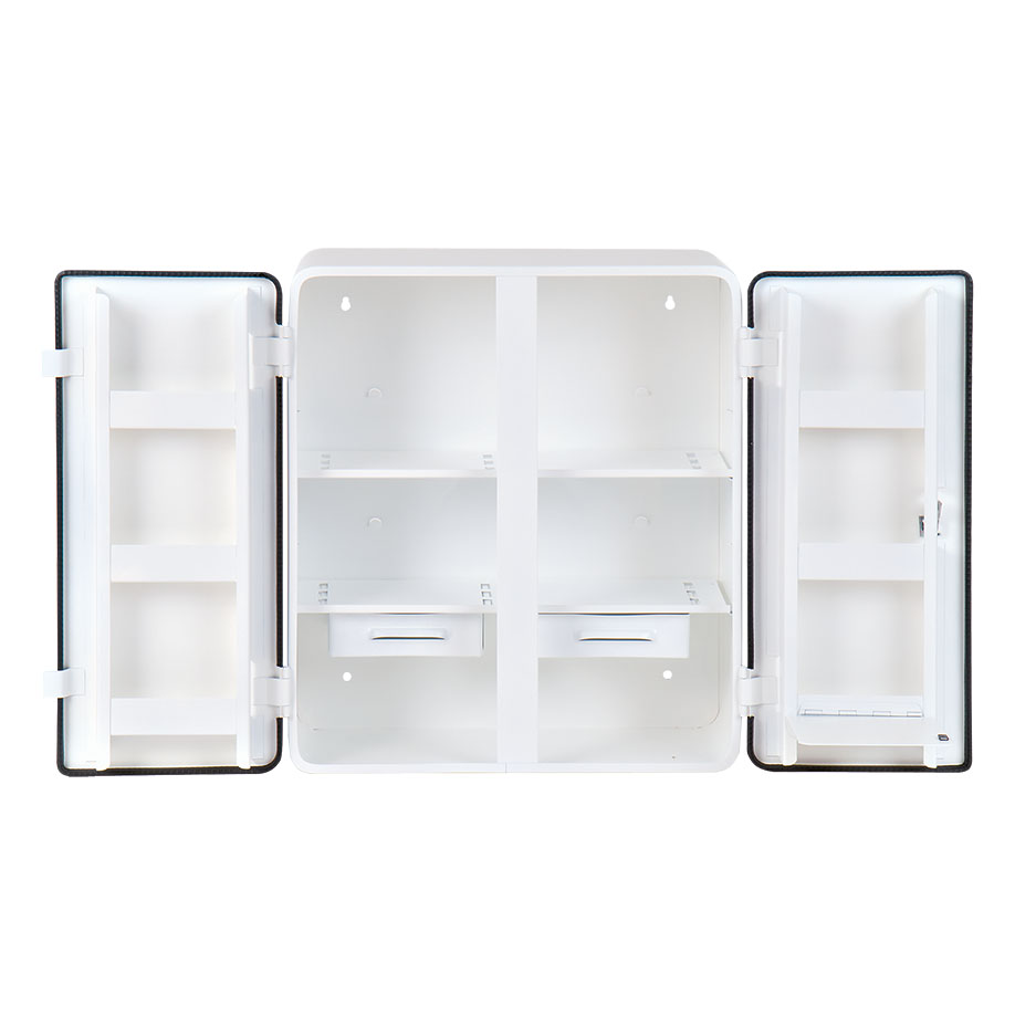 Ca. 404 x 462 x 170 mm, Stahlblech, weiß, Sicherheitsschloss, zwei Schlüssel. Verbandschrank zweitürig, zwei Einlegeböden, zwei Schubladen, Türen mit je drei Ablageschalen, klappbares Ablagetableau. Die Inneneinrichtung kann durch ein Medikamentenfach, einen zusätzlichen Einlegeboden und bis zu vier Schubladen erweitert werden.