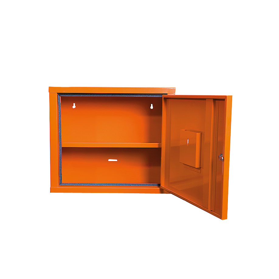 Ca. 490 x 420 x 200 mm, Qualitäts-Feinblech, orange, eintürig, verschließbar, 1 fester Fachboden. Sicherheitsschloss mit 2 Schlüsseln, Notschlüsselfach in der Tür.