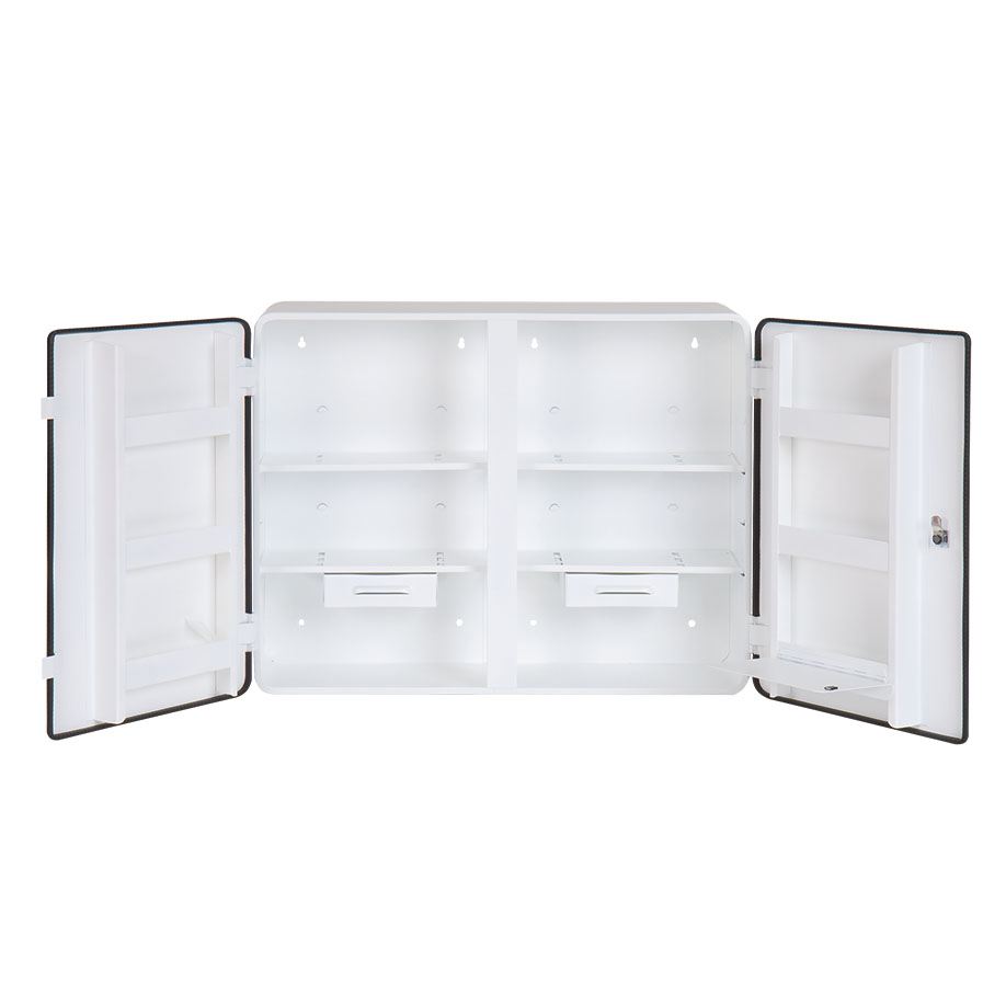 Ca. 604 x 462 x 170 mm, Stahlblech, weiß, Sicherheitsschloss, zwei Schlüssel. Verbandschrank zweitürig, verschließbar, vier Einlegeböden, zwei Schubladen, Türen mit je drei Ablageschalen, klappbares Ablagetableau. Erweiterbar durch Medikamentenfach, zwei Zusatzböden und bis zu vier Schubladen.