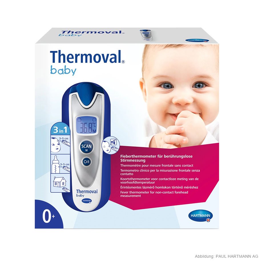 - visueller Fieberalarm: Bei einer Stirntemperatur von 37,6 °C leuchtet das Display rot auf (in allen anderen Fällen leuchtet es blau)