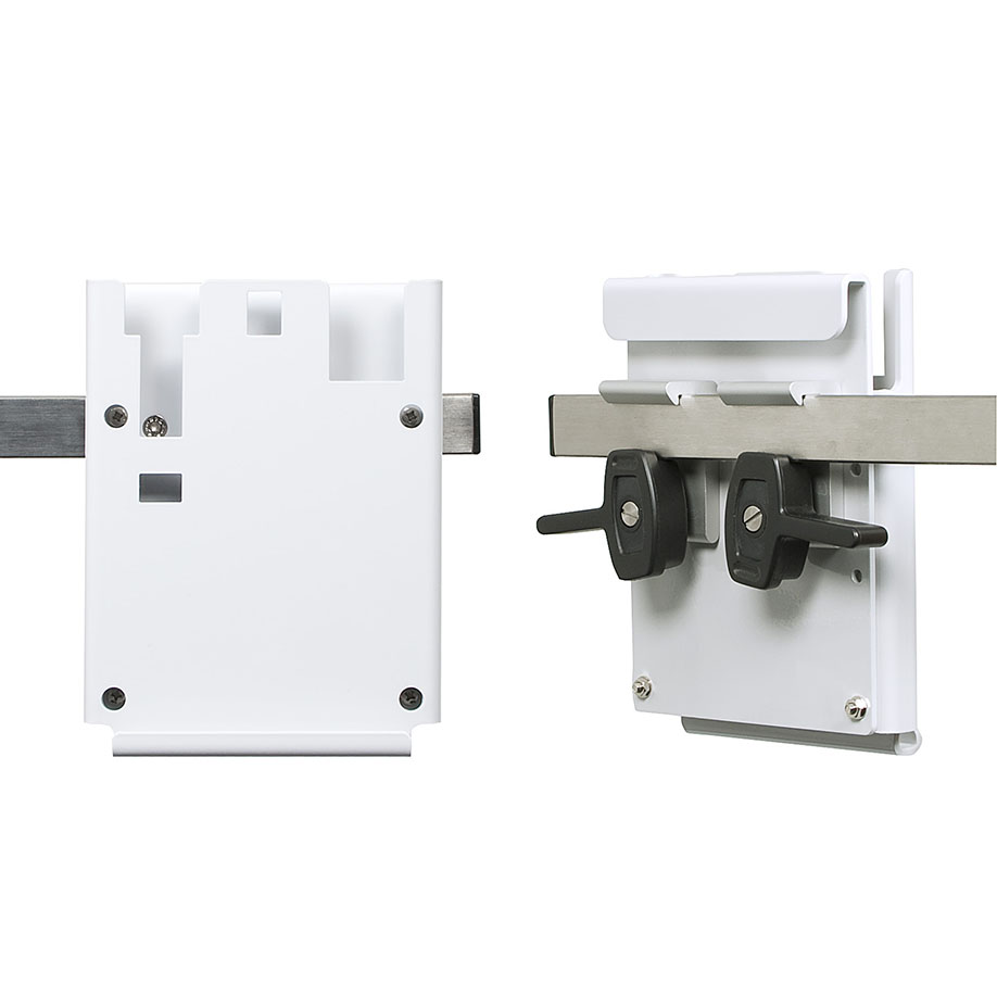 Zum Einhängen in Geräteschiene bitte zusätzlich bestellen: Halteblech für Geräteschiene (WM 15845), zur Fixierung an Geräteschiene mittels Halteklauen bitte zusätzlich bestellen: Halteblech für Geräteschiene (WM 15845) und Anbauset mit 2 Adaptern (WM 15805), zur Fixierung an einer Stange Ø 19 mm - 40 mm bitte zusätzlich bestellen: Halteblech für Geräteschiene (WM 15845) und Anbauset für Stangenhalterung (WM 15806).