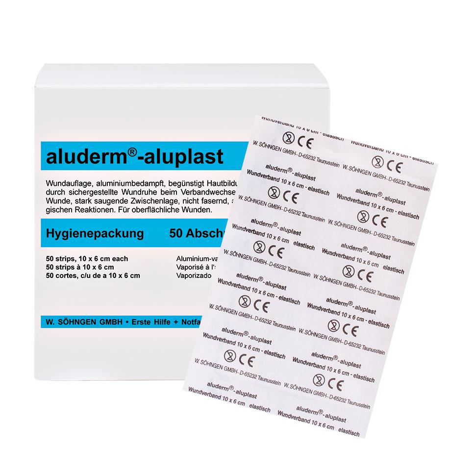 Aluminiumbedampftes aluderm®-aluplast Wundverbandpflaster, 6 cm breit, in Abschnitten à 10 cm einzeln eingesiegelt.